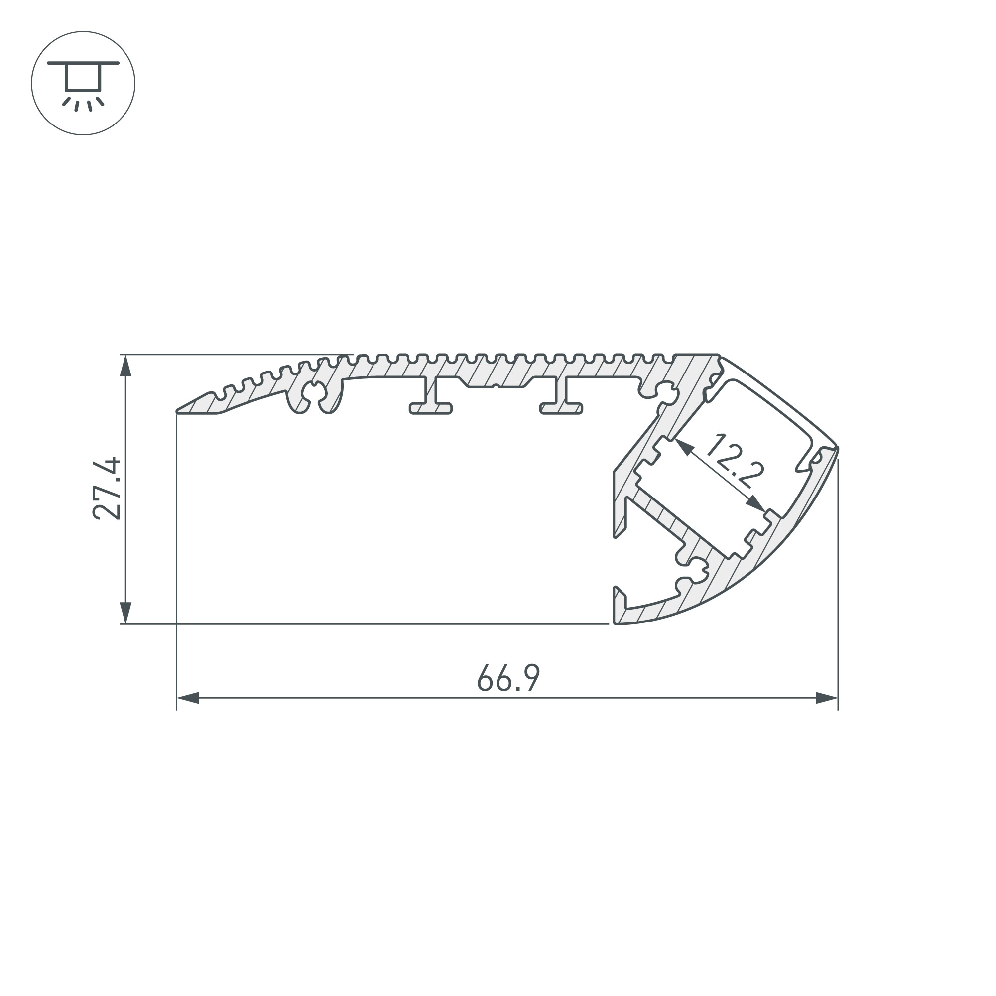 Анодированный профиль 2м Alu-Stair в комплекте с матовым экраном. Для подсветки ступеней в жилых помещения. Для лент и линеек шириной до 12мм. Ширина 66.9мм х высота 27.3 мм. Высота накладки на ступень 6мм. Цена за к-т 2м.