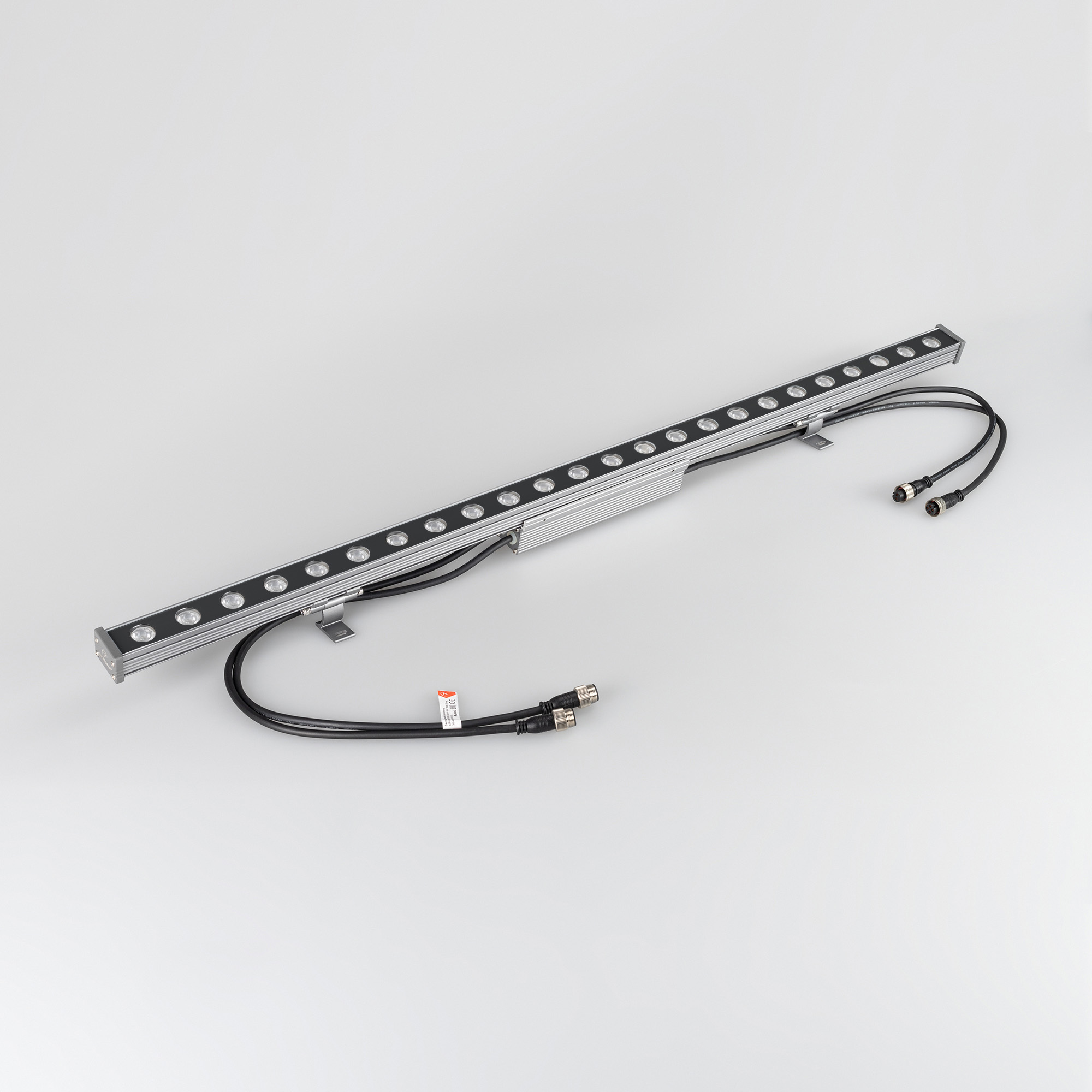 Ультратонкий линейный светодиодный прожектор. Мощность 24W, напряжение питания DC 24V. Светодиоды EPILED 24 штуки. Цвет светодиодов RGB, управление по протоколу DMX512, угол рассеивания 30°. Корпус: алюминиевый сплав и армированное стекло. Цвет корпуса серый, степень влагозащиты IP65. Габариты 1000x40x30мм.