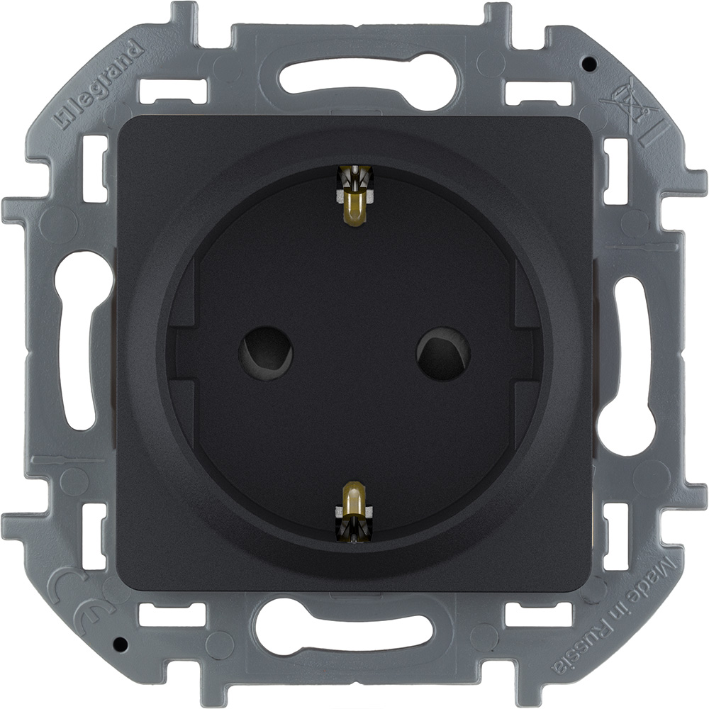 Розетка с заземлением и интегрированными защитными шторками Legrand Inspiria для скрытого монтажа , цвет "Антрацит". Максимальный ток 16 А, напряжение ~250В, максимальная мощность 3680 Вт.
