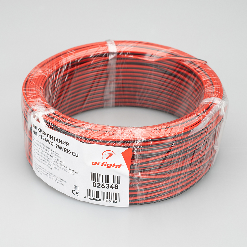 Шлейф для питания и управления одноцветными светодиодными лентами. 2 проводника, калибр проводника 18AWG, сечение проводника 0.84 мм?, материал проводника - лужёная медь. Внешняя оболочка - ПВХ красного и чёрного цветов. Длина кабеля в бухте - 50 метров.