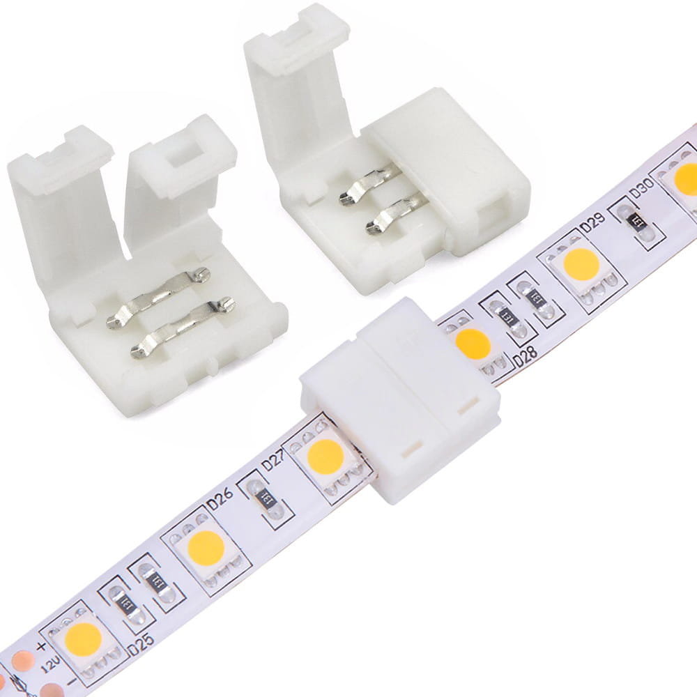 2-х сторонний разъем с фиксаторами для соединения 2-х отрезков светодиодных одноцветных лент шириной 10мм. Без провода. Материал - пластик. Максимальный допустимый ток 4А. Не рекомендуется соединять длинные отрезки лент!