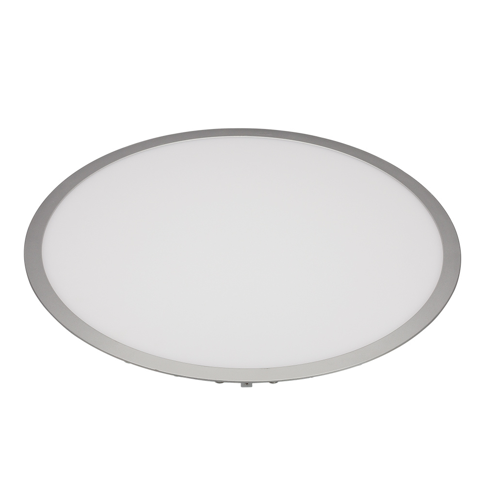Круглая тонкая панель, серебристый корпус. Мощность 48Вт / БЕЛЫЙ 6000K / 4080лм / 120°. CRI >80, smd2835. IP42. Размер Ф600мм, ширина рамки 27мм, врезное отверстие 586мм. Питание 200-240 VAC. В комплекте драйвер (1200mA, 27-42V), 6шт пружины для фиксации.