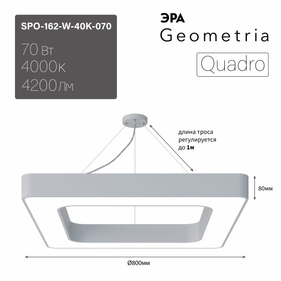 Светильник LED Geometria SPO-162-W-40K-070 Quadro 70Вт 4000K 5200Лм 800*800*80 белый подвесной драйвер внутри Подвесные светильники Geometria различных форм и размеров позволят реализовать дизайнерские идеи освещения пространства. Для каждой модели доступно 2 варианта цвета: белый и черный. Предусмотрена возможность регулировки высоты установки до 1м при помощи троса. В комплект поставки входит круглое крепление к потолку. Подвесная система максимально эстетична, питание идет по тросу. Корпус изготовлен из стали, покрытой порошковой окраской. Драйвер находится внутри светильника, входит в комплект.