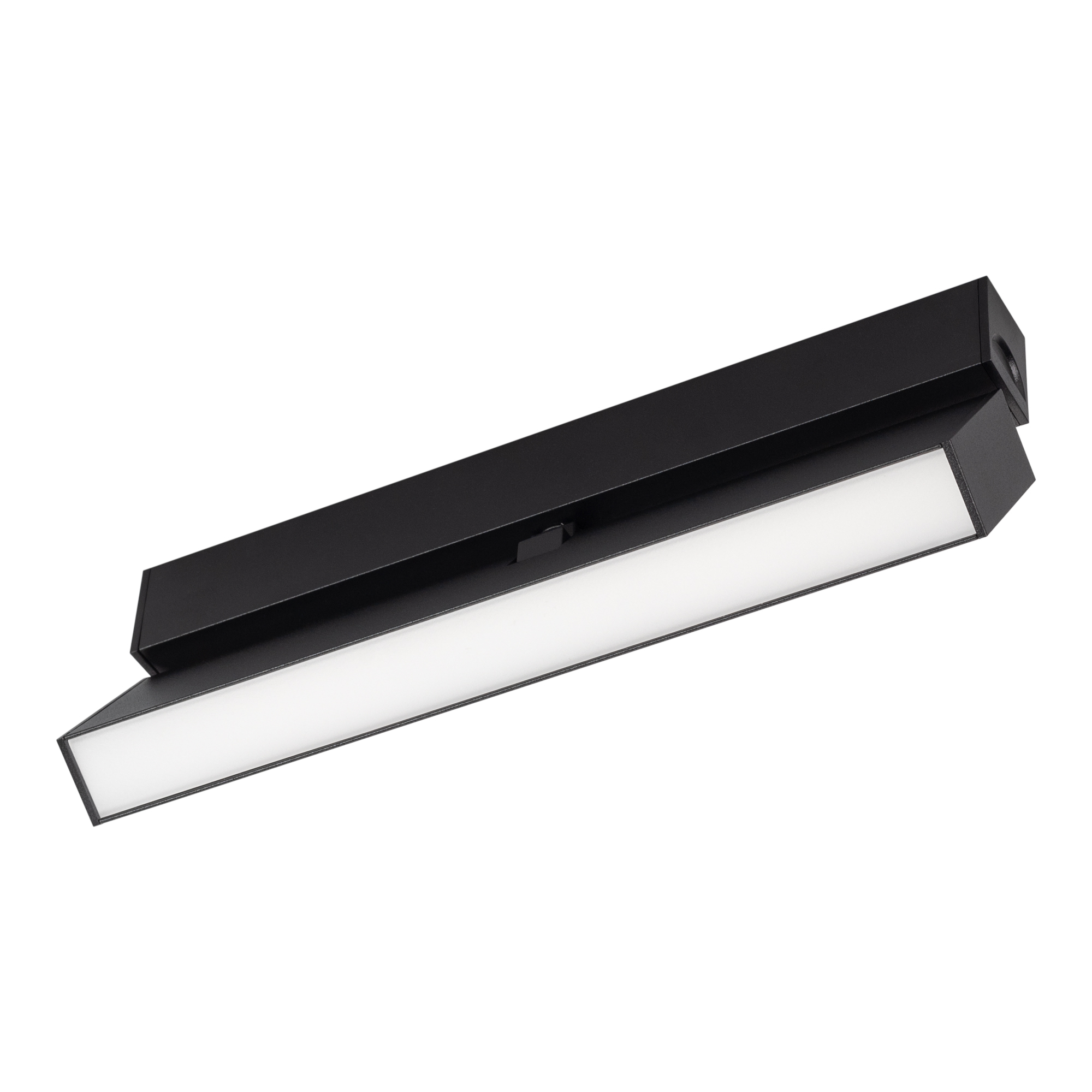 Светильник поворотный для магнитных треков шириной 25мм, 6Вт. Цвет свечения ДНЕВНОЙ 4000K, световой поток 370лм, угол 100°, CRI>90. Корпус прямоугольный, металл, цвет черный, IP20. Размеры LxWxH 204x20x46мм. Входное напряжение DC24V, мощность 6Вт. Драйвер DС24V/AC230V поставляется отдельно.