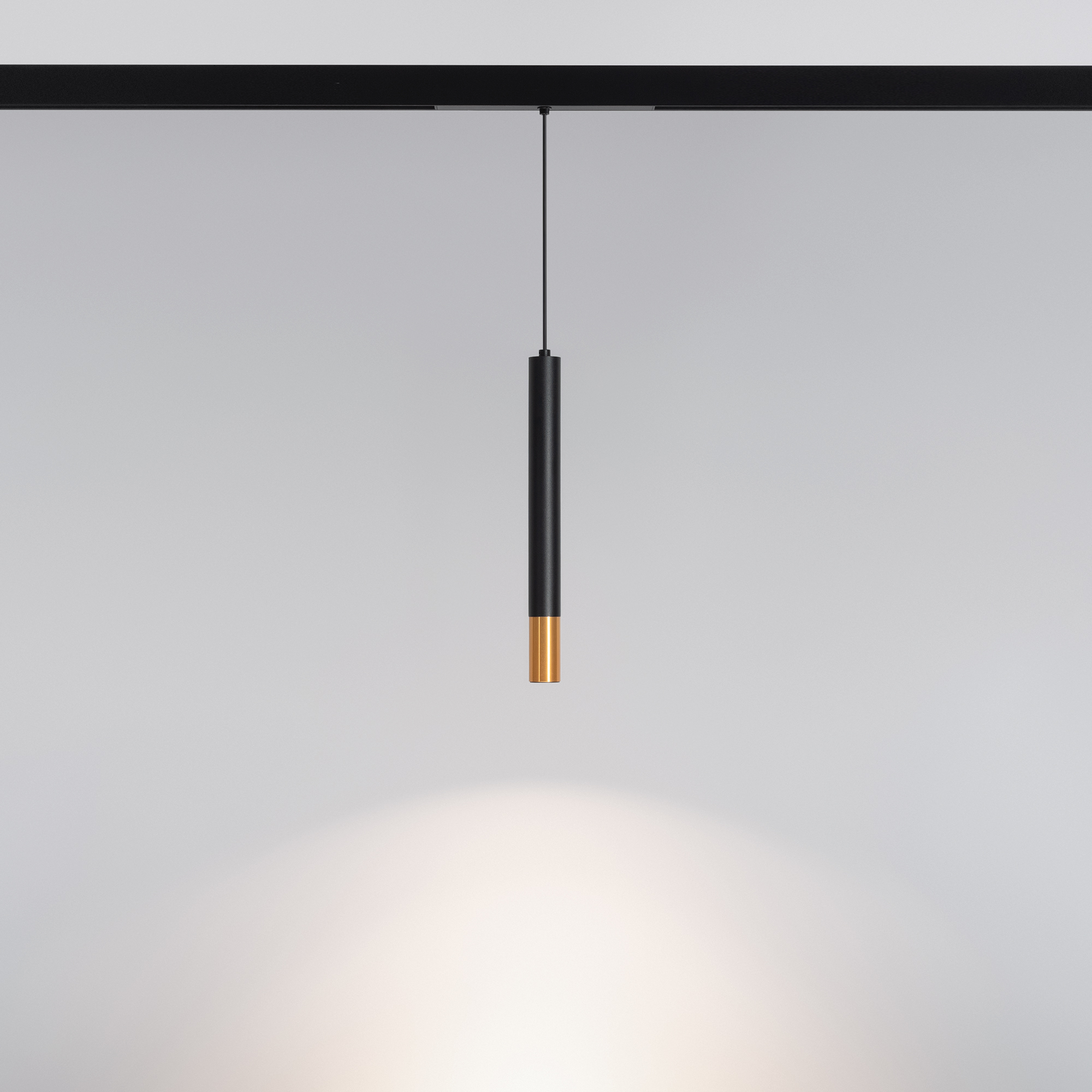 Светильник подвесной для магнитных треков шириной 25мм, 5Вт. Цвет свечения ДНЕВНОЙ 4000K, световой поток 300лм, угол 45°, CRI>90. Корпус цилиндрический, металл, цвет черный с золотой вставкой, IP20. Размер светового модуля 30*300 мм; размер установочного модуля 200*20*25мм; длина подвеса 1400 мм. Входное напряжение DC24V, мощность 5Вт. Драйвер DС24V/AC230V поставляется отдельно.