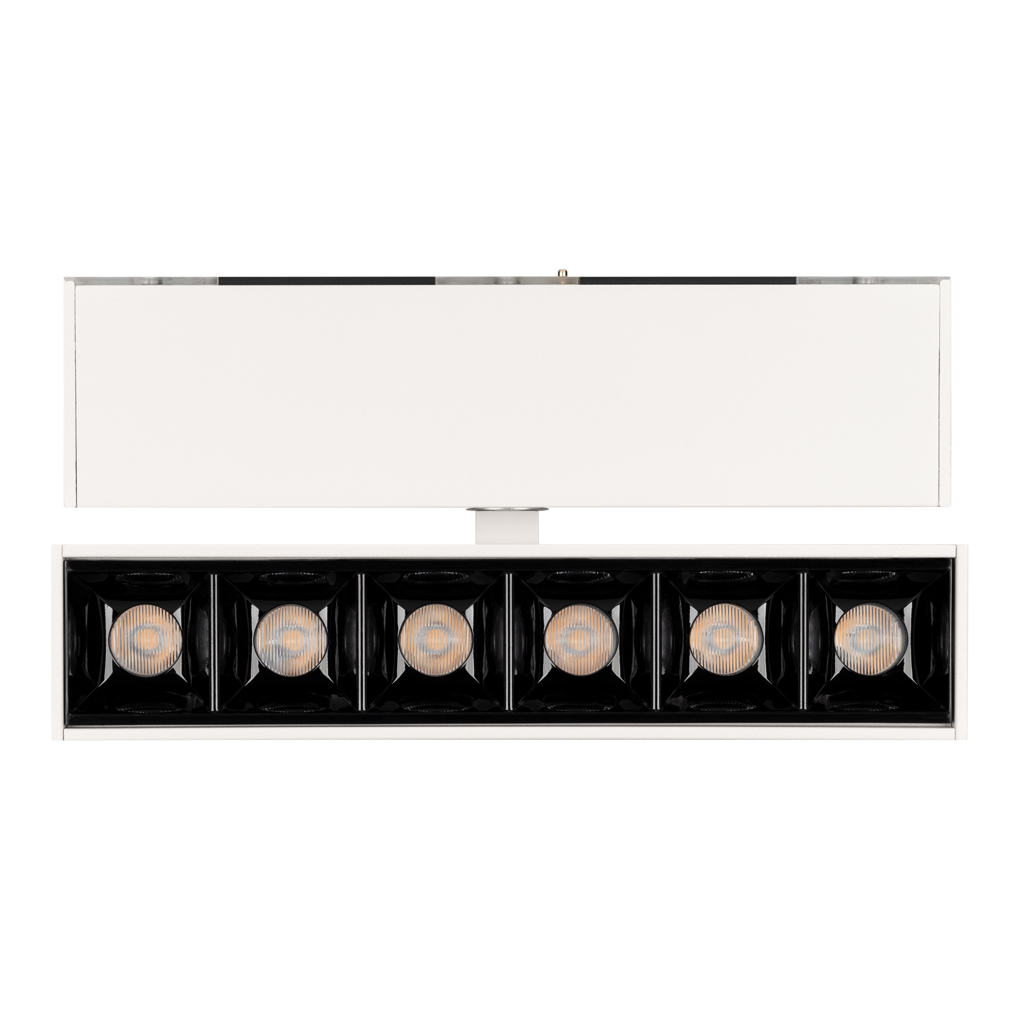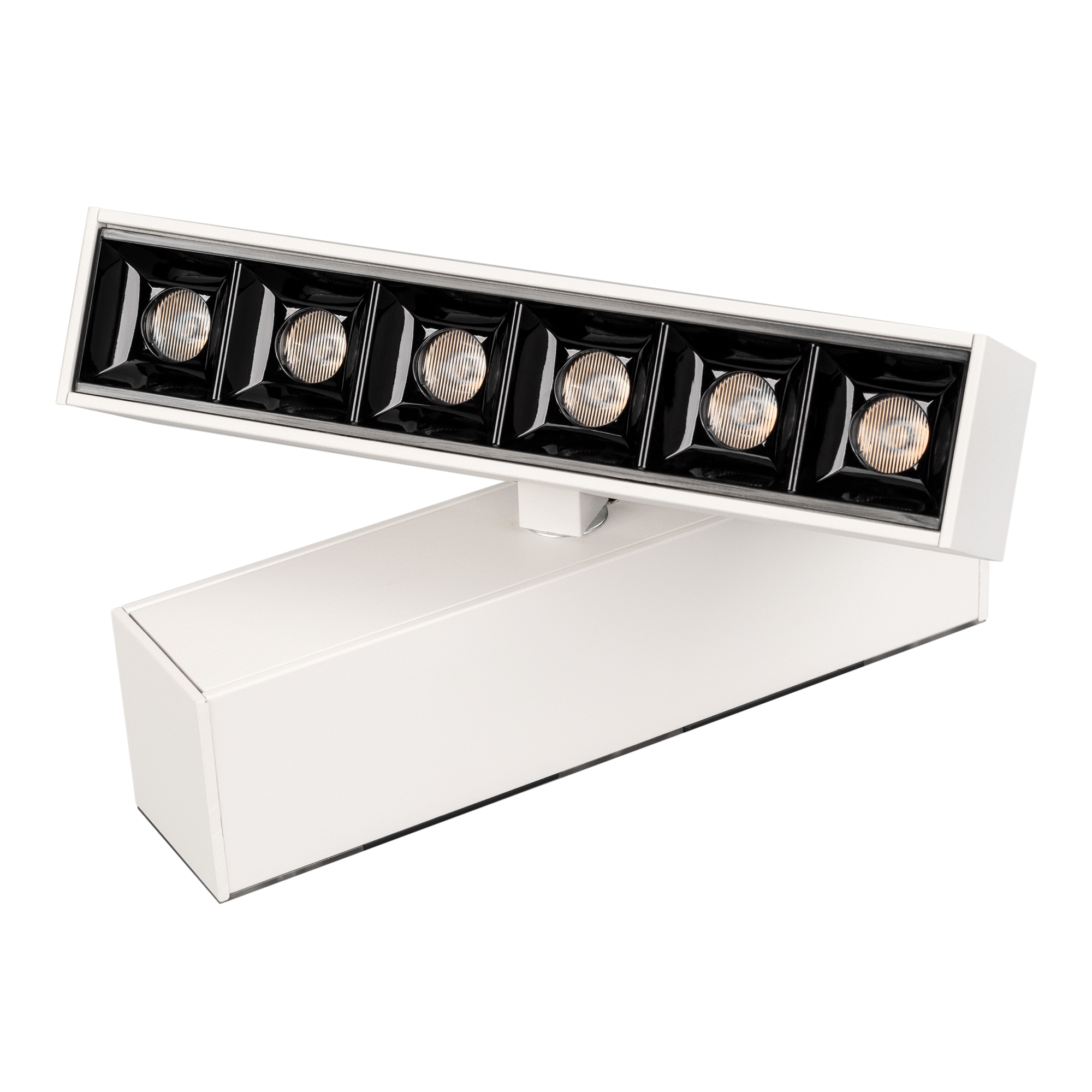Светильник поворотный для магнитных треков шириной 45мм, 6Вт. Цвет свечения ДНЕВНОЙ 4000K, световой поток 455лм, угол 15°, CRI>90. Корпус прямоугольный, металл, цвет белый, IP20. Размеры LxWxH 163x35x92.5мм. Входное напряжение DC24V, мощность 6Вт. Драйвер DС24V/AC230V поставляется отдельно. Диммируется только с 026407.