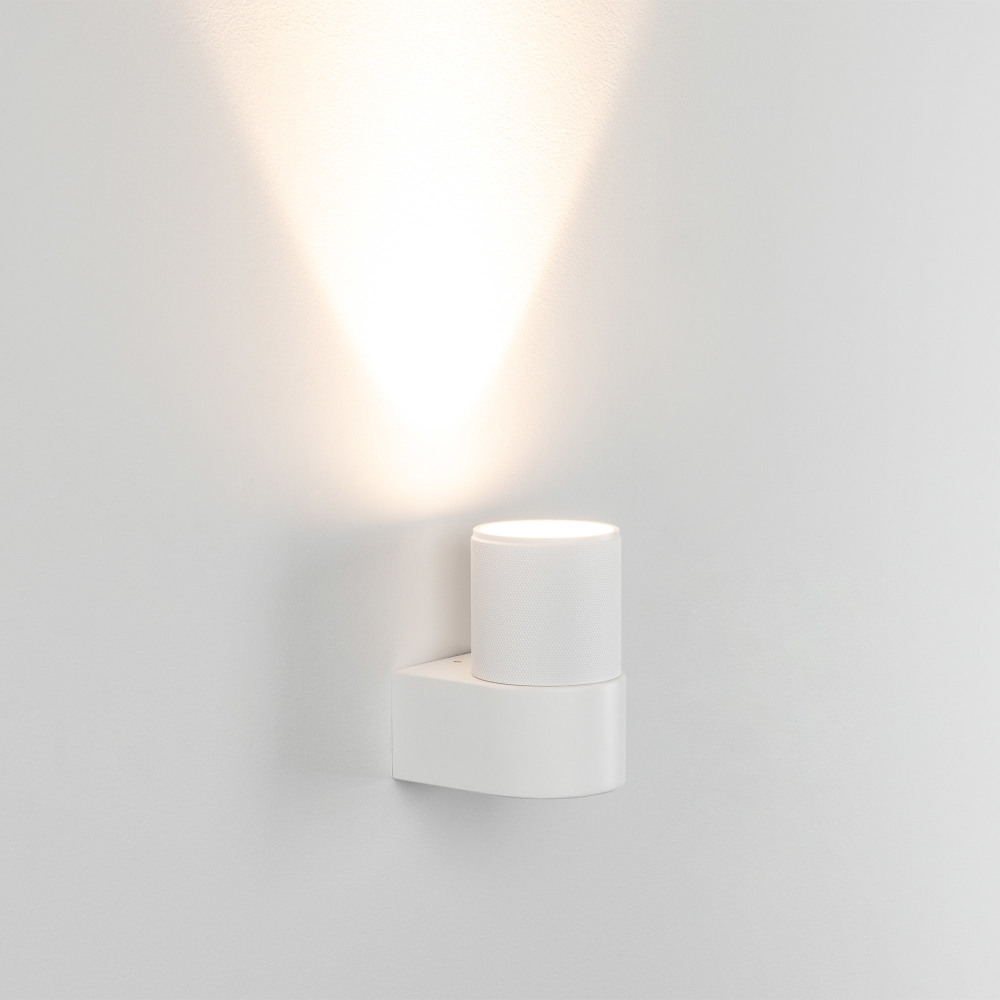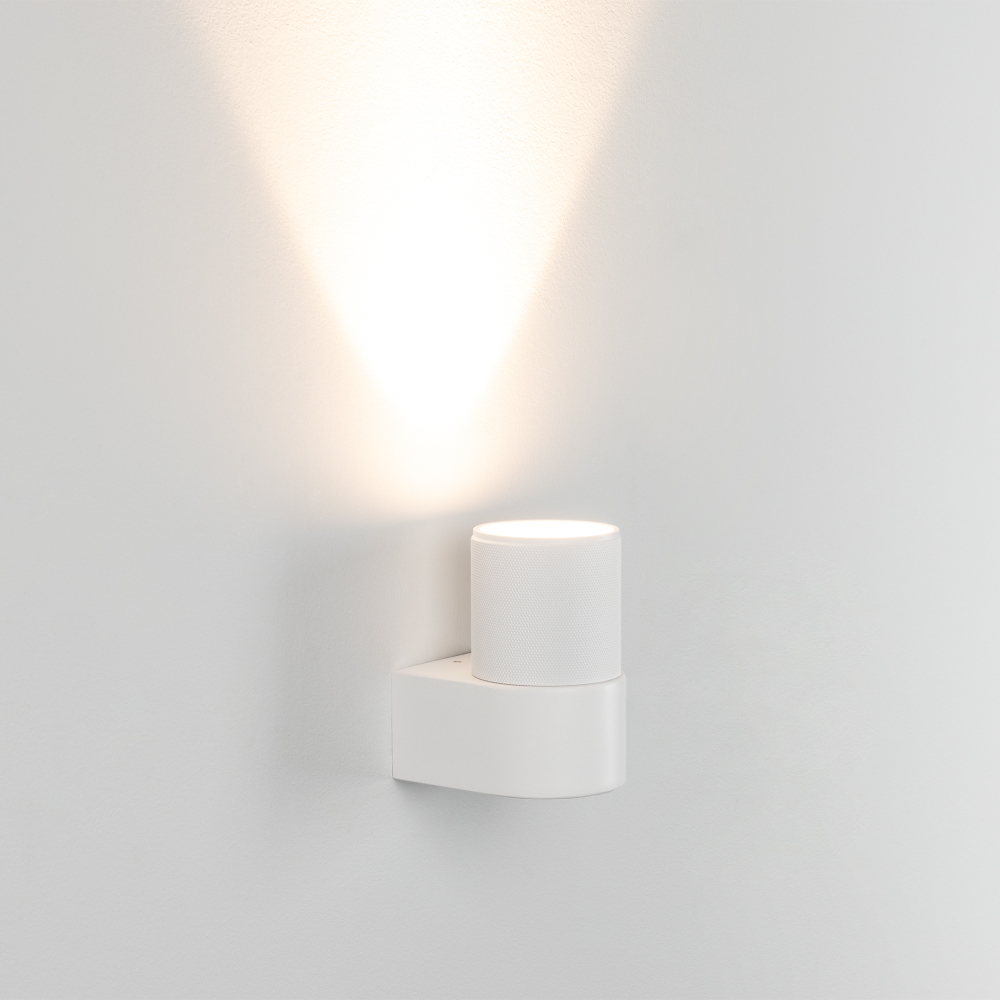 Настенный светильник со свечением в верхнюю или нижнюю полусферу. Мощность 6 Вт, св. поток 360 лм, 55 лм/Вт, теплый 3000 K, CRI>90, угол 40°, напряжение питания 230 В. Белый фигурный корпус из алюминия, степень защиты IP20. Размер: длина 110 мм, ширина 72 мм, высота 115 мм. Монтаж накладной. Драйвер 26-40 В, 150 мА, пульсация <1%.