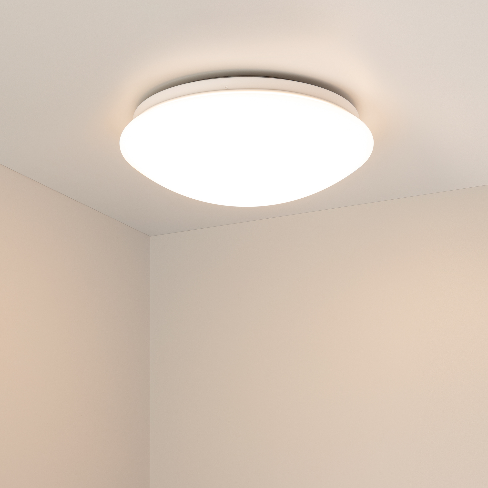 Накладной светильник. Мощность 12Вт, св. поток 850 лм, 70лм/Вт, теплый 3000 K, CRI>80, угол 120°, напряжение питания 230 В. Круглый пластиковый корпус, плафон пластик, степень защиты IP44. Размер: диаметр 280 мм, высота 100 мм. Монтаж накладной. Драйвер встроенный, пульсация <5%.