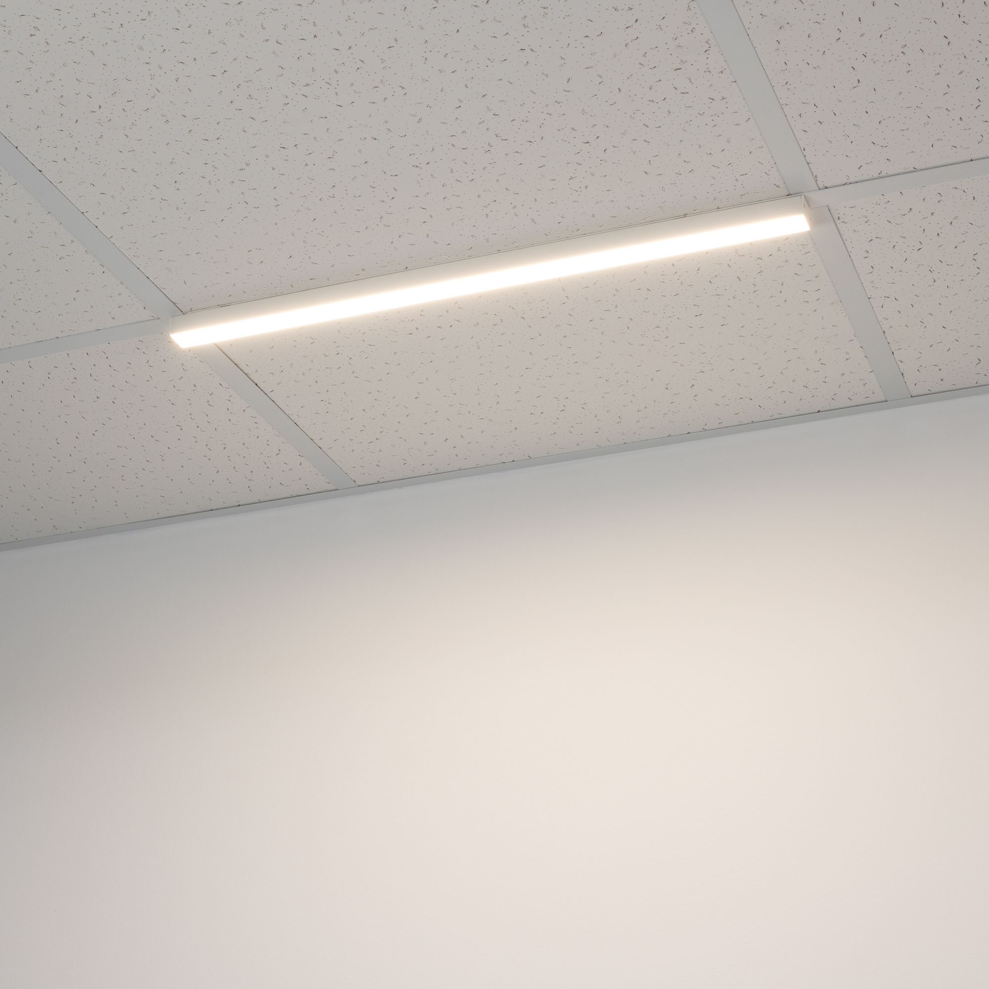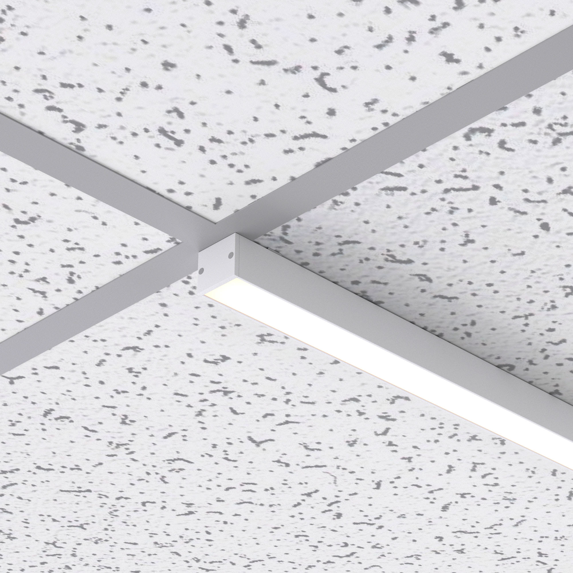 Светодиодный светильник для направляющих потолка Армстронг шириной 15 и 24 мм. Мощность 13 Вт, св. поток 1238 лм, 96 лм/Вт, дневной 4000K, CRI>80, угол 120°, напряжение питания 48 В. Белый квадратный корпус из алюминия, экран PS, степень защиты IP40. Размер: длина 600 мм, ширина 25 мм, высота 28 мм. Монтаж накладной. Драйвер поставляетя отдельно.