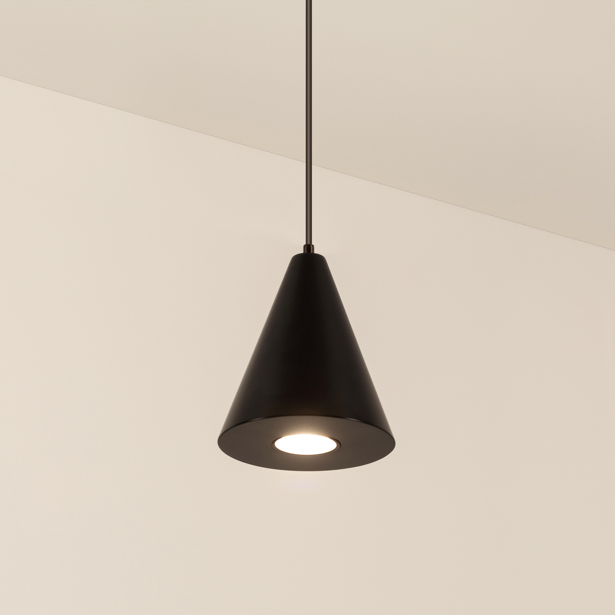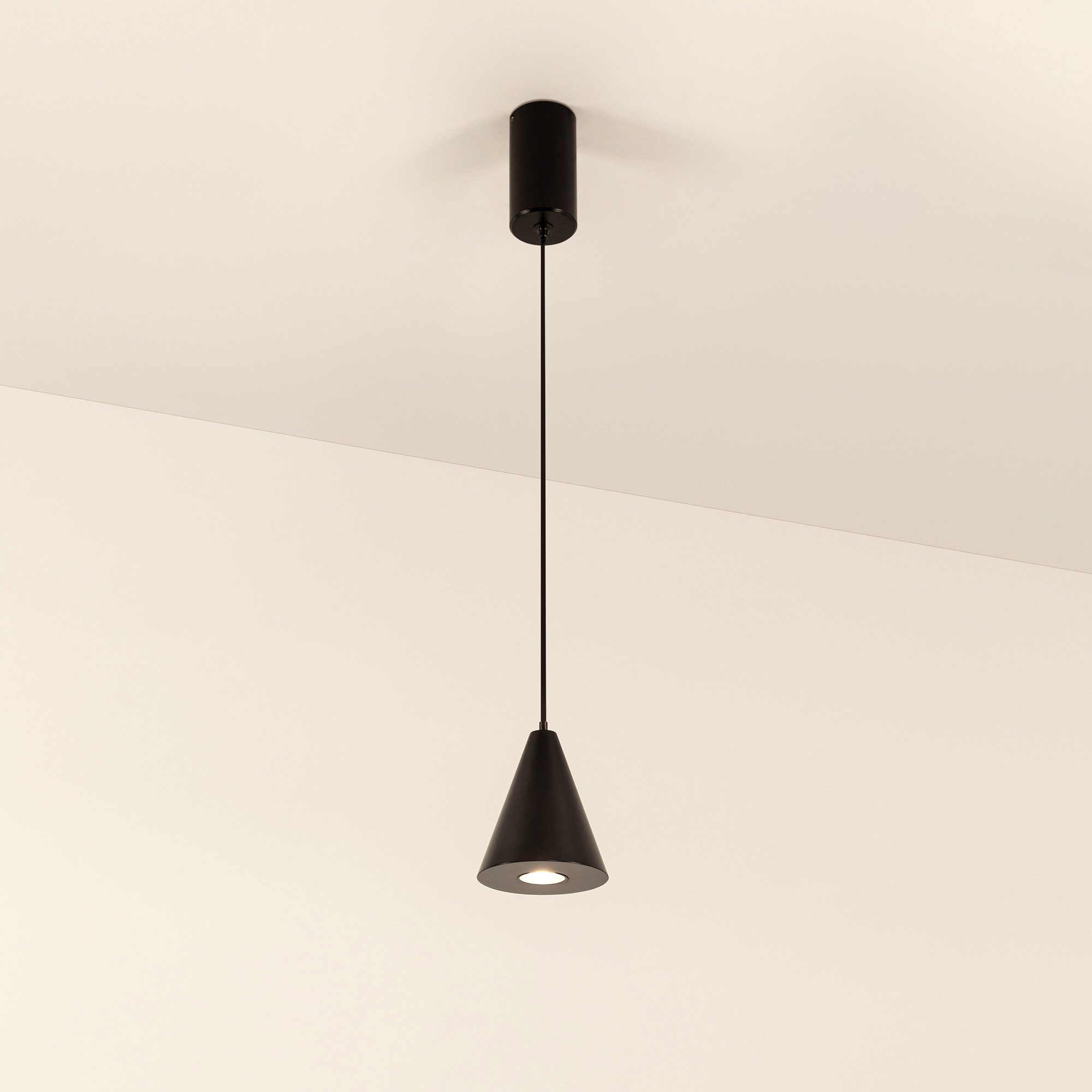 Подвесной светильник. Мощность 9 Вт, св. поток 650 лм, 73 лм/Вт, теплый 3000 K, CRI>80, угол 39°, напряжение питания 230 В. Черный корпус из алюминия, экран , степень защиты IP40. Размер: диаметр 83 мм, высота 97 мм. Монтаж подвесной, длина подвеса 1500мм, регулируемая. Габариты чаши 50x95 мм. Драйвер 28-42 В, 250 мА, пульсация <5%.