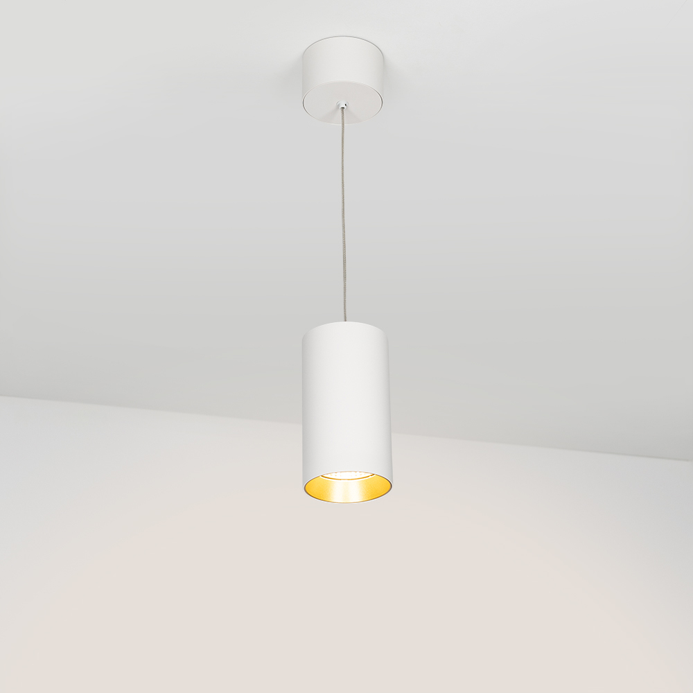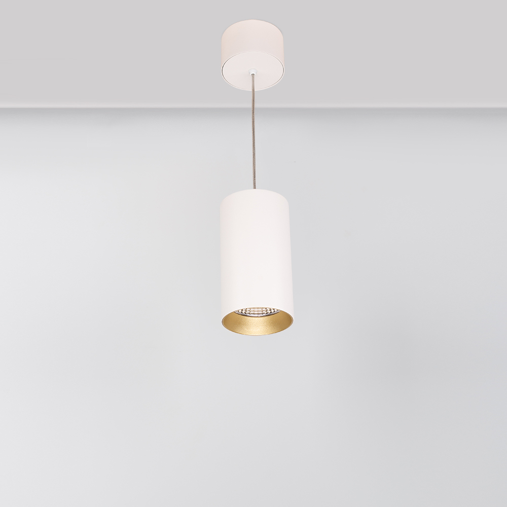Подвесной светильник 15Вт, белый круглый корпус, золотистая вставка, металл. Цвет ТЕПЛЫЙ БЕЛЫЙ 3000K, св.поток 1100лм, CRI(Ra)>80, угол 40°. Размер ?85x155мм. Встроенный драйвер PRI:220-240VAC, SEC:DC 350mA 30-43V 15Вт.