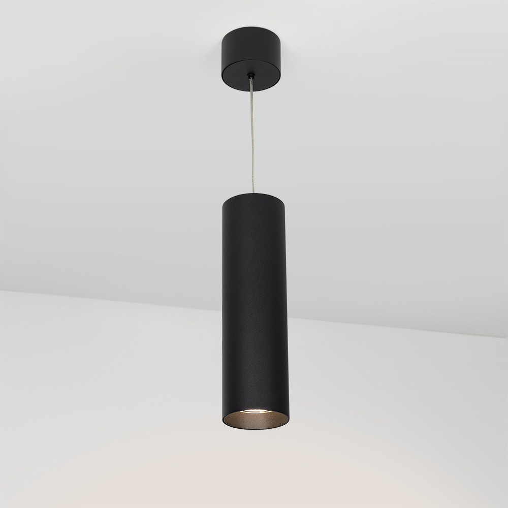Подвесной светильник 15Вт, черный круглый корпус, черная вставка, металл. Цвет свечения БЕЛЫЙ ТЕПЛЫЙ 3000K, св.поток 1100лм, CRI(Ra)>80, угол 40°. Размер ?85x300мм, встроенный драйвер PRI:220-240VAC, SEC:DC 350mA 30-43V 15Вт.