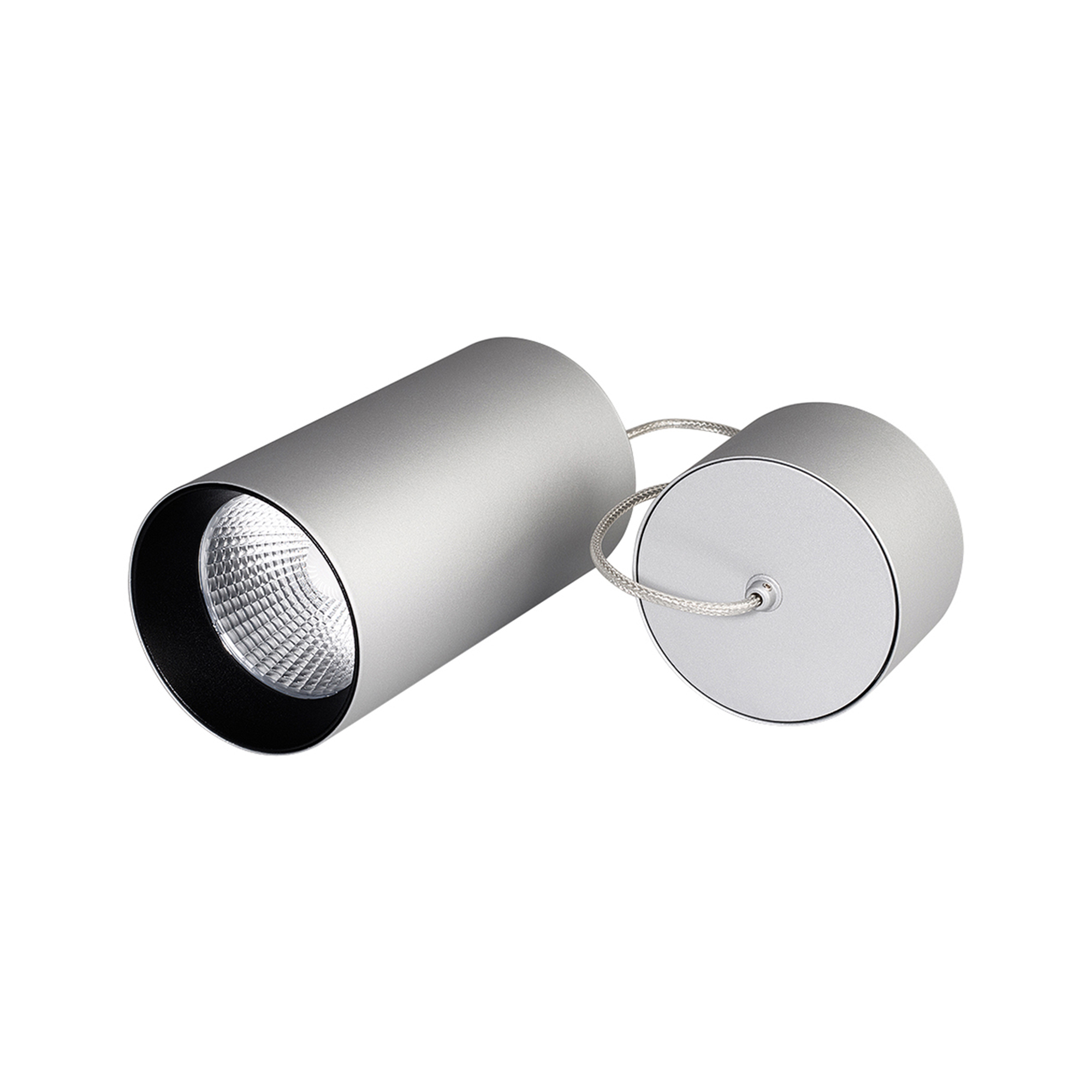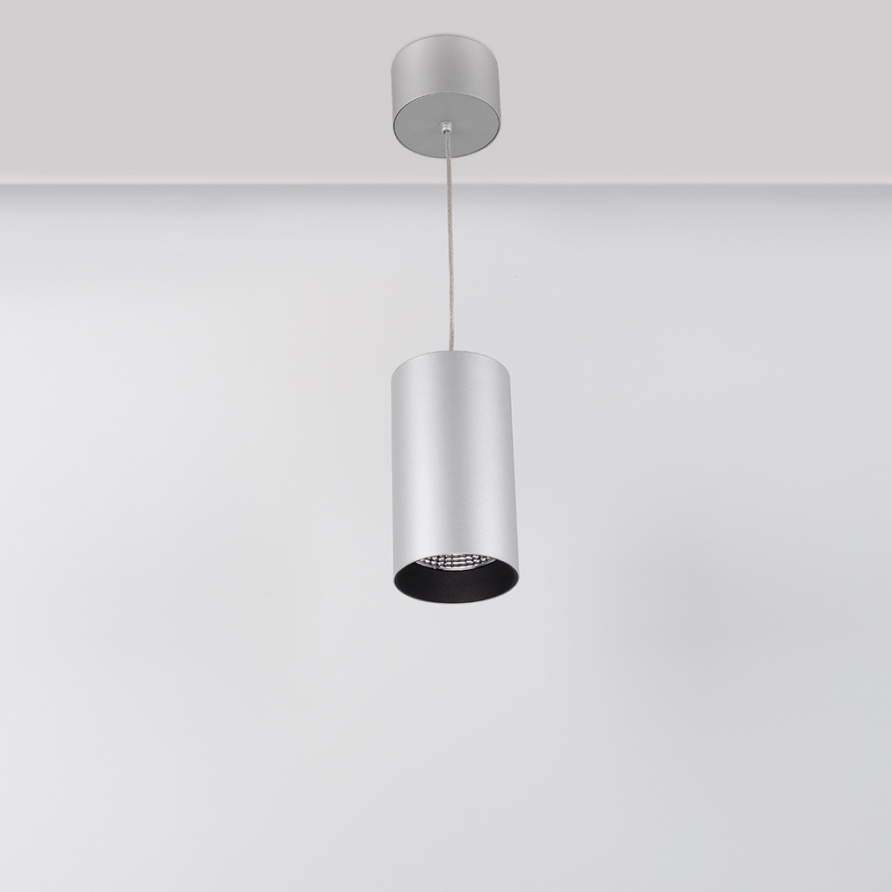 Подвесной светильник 15Вт, серебристый круглый корпус, черная вставка, металл. Цвет ДНЕВНОЙ БЕЛЫЙ 4000K, св.поток 1100лм, CRI(Ra)>80, угол 40°. Размер Ø85x155мм. Встроенный драйвер PRI:220-240VAC, SEC:DC 500mA 23-36V 15Вт.
