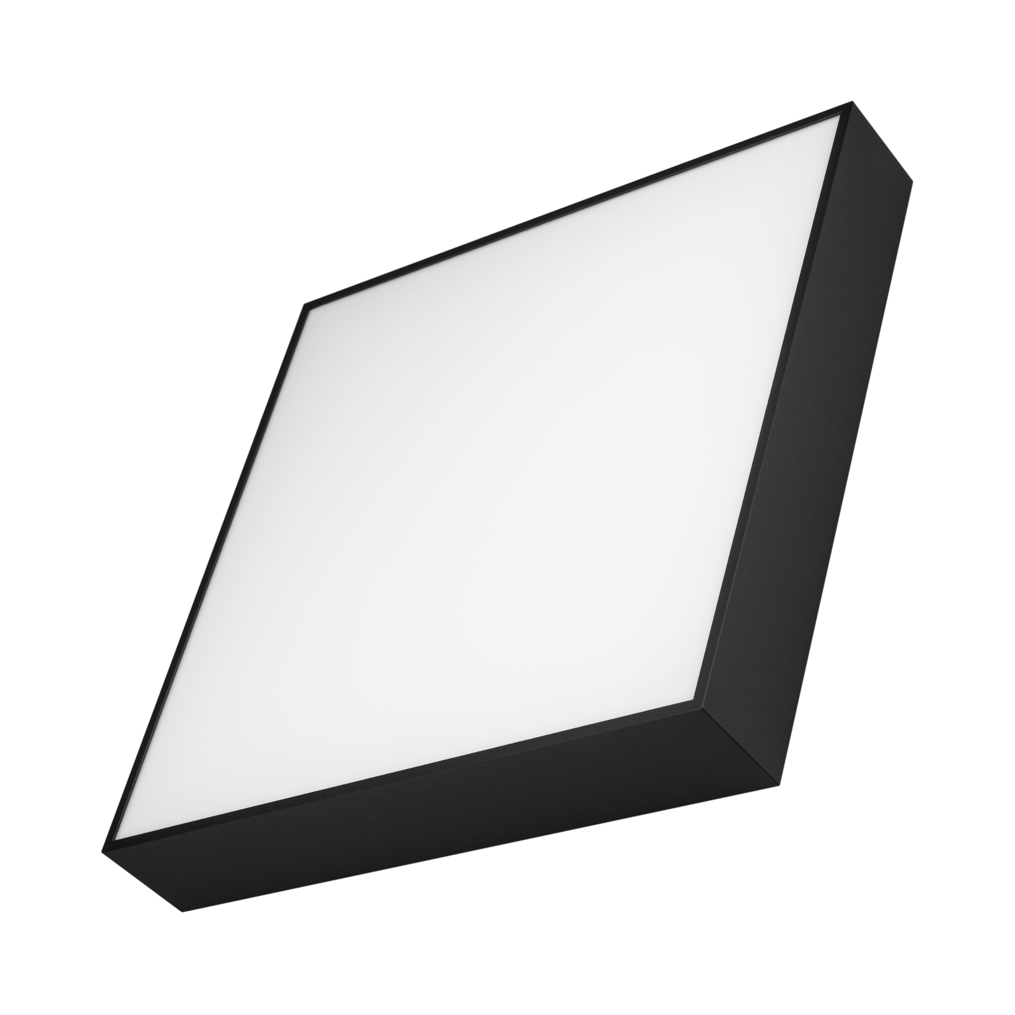 Накладной светильник. Мощность 40 Вт, св. поток 3800 лм, 90-100 лм/Вт, теплый 3000 K, CRI>90, угол 120°, напряжение питания 230 В. Черный квадратный корпус из алюминия, экран PC, степень защиты IP40. Размер: длина 400 мм, ширина 400 мм, высота 64 мм. Монтаж накладной. Драйвер 27-40 В, 1000 мА, пульсация <5%.