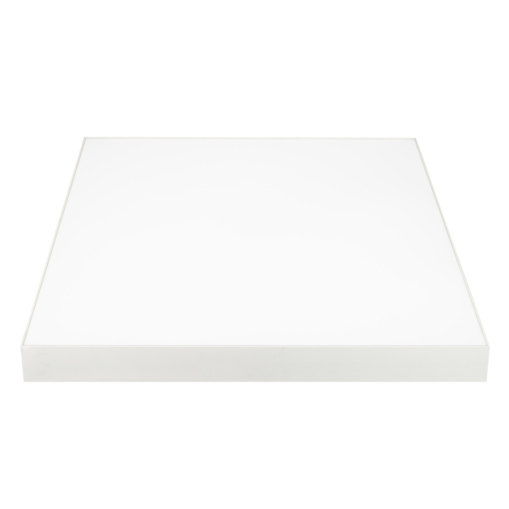 Накладной светильник. Мощность 60 Вт, св. поток 5700 лм, 90-100 лм/Вт, дневной 4000 K, CRI>90, угол 120°, напряжение питания 230 В. Белый квадратный корпус из алюминия, экран PC, степень защиты IP40. Размер: длина 600 мм, ширина 600 мм, высота 64 мм. Монтаж накладной. Драйвер 27-40 В, 1500 мА, пульсация <5%.