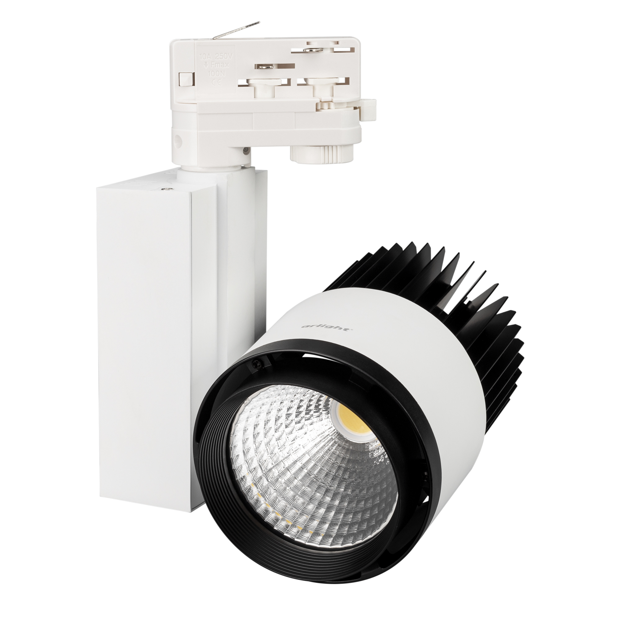 Подвесной светильник для треков/шин 4 провода. Светодиод CREE 40W цвет БЕЛЫЙ 5000K св.поток 3200-3600 лм угол 24°. Белый корпус черная рамка и радиатор. Мощность 40Вт питание AC180-240V. Максимальные габариты HxLxW: 205х165х160 мм