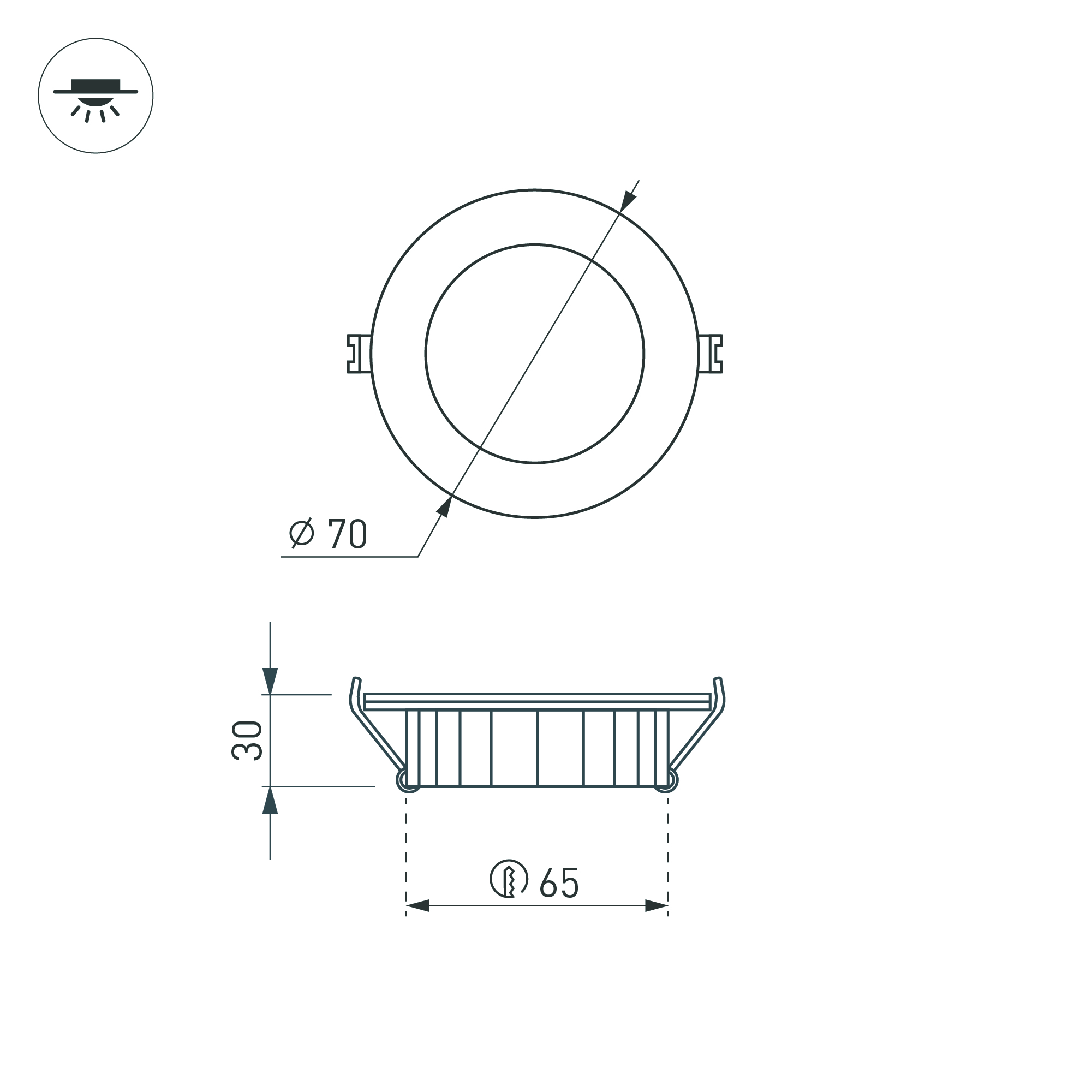 Врезной круглый мебельный светильник 4.5Вт, корпус белый алюминий. Цвет БЕЛЫЙ 6000K. Светодиод 1х4.5W. CRI>80, Св.поток 315-360лм, угол 110°. Питание 110-240VAC, 4.5Вт, 300mA 13-16V, драйвер в комплекте. Размеры d70x30 мм, врезное отверстие d65 мм.