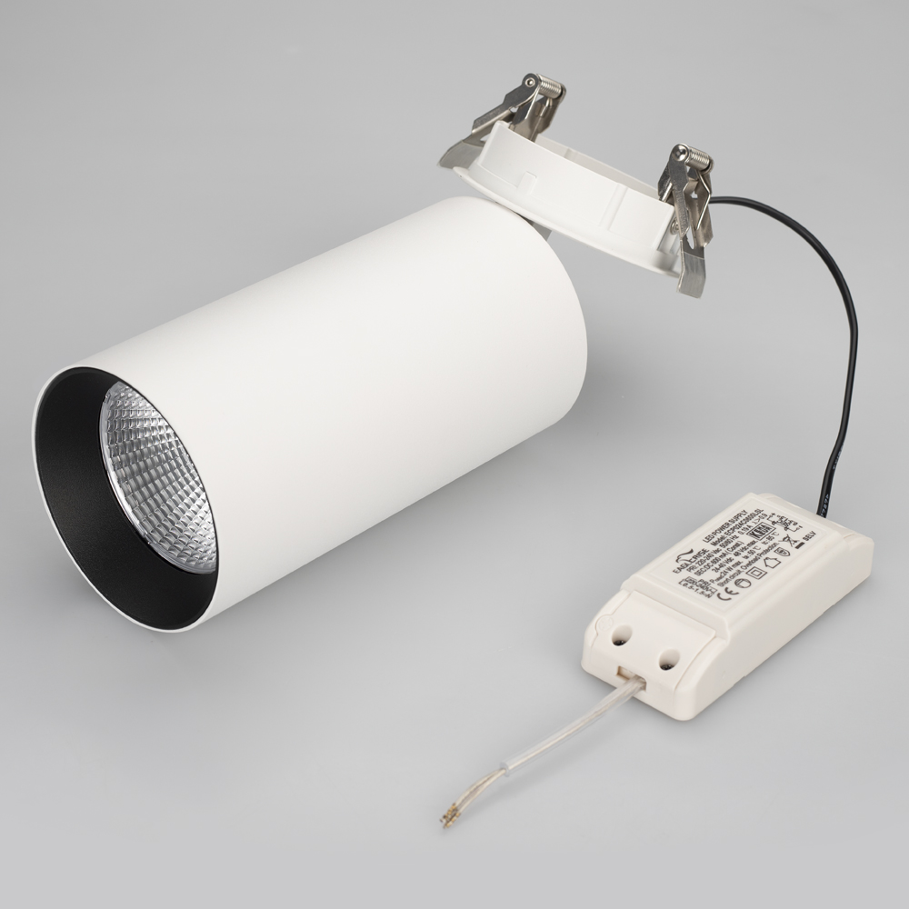 Встраиваемый откидной светильник 25Вт, белый круглый корпус, черная вставка, металл. Цвет свечения ДНЕВНОЙ 4000K, св.поток 2530лм, CRI(Ra)>80, угол 40°. Размер DxH ?100x220мм, отверстие для установки ?90мм. Встроенный драйвер PRI:220-240VAC, SEC:DC 600mA 30-43V 25Вт.