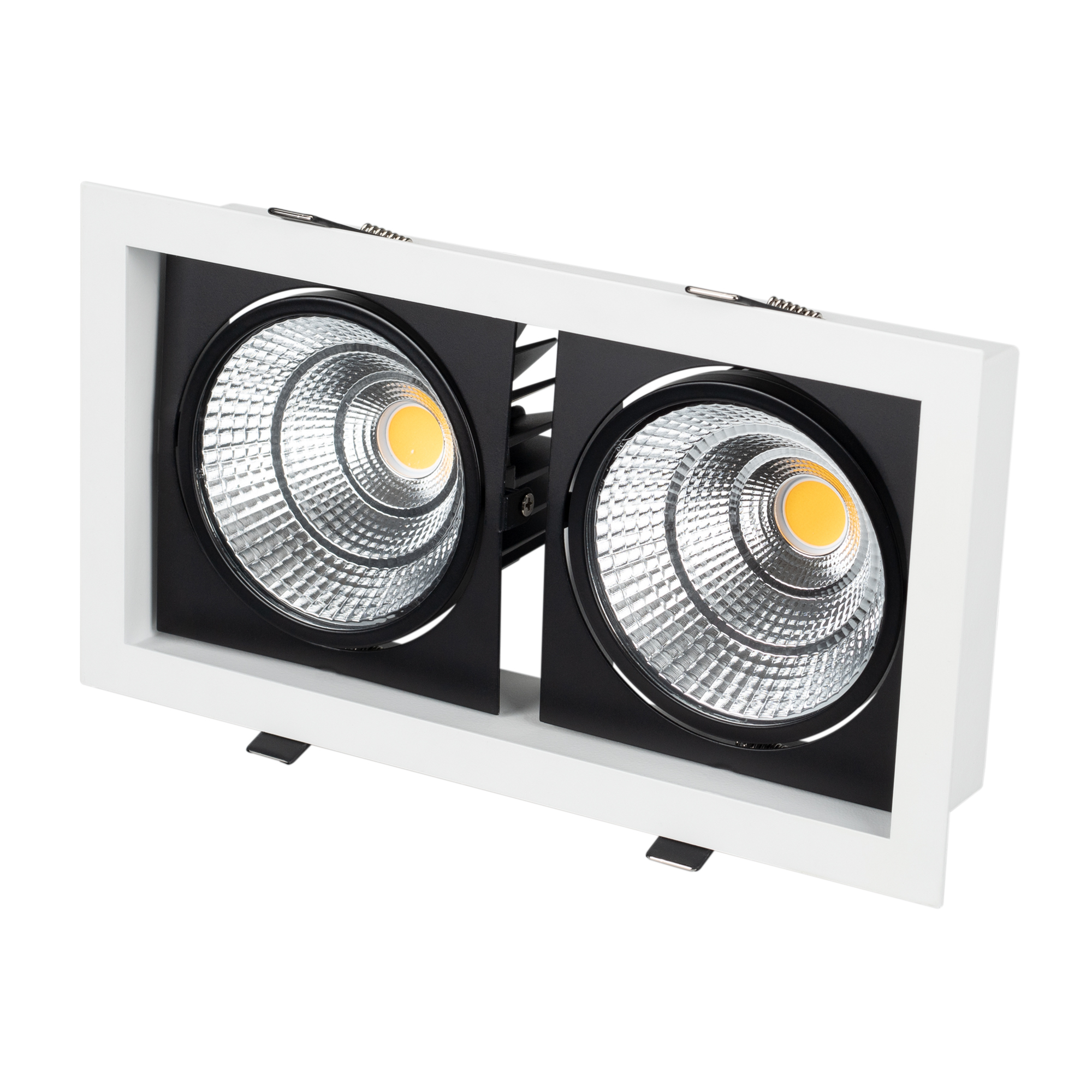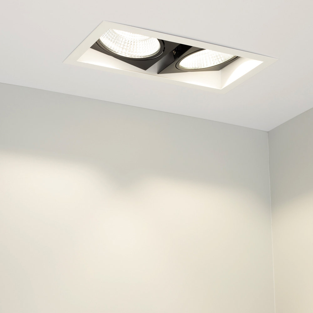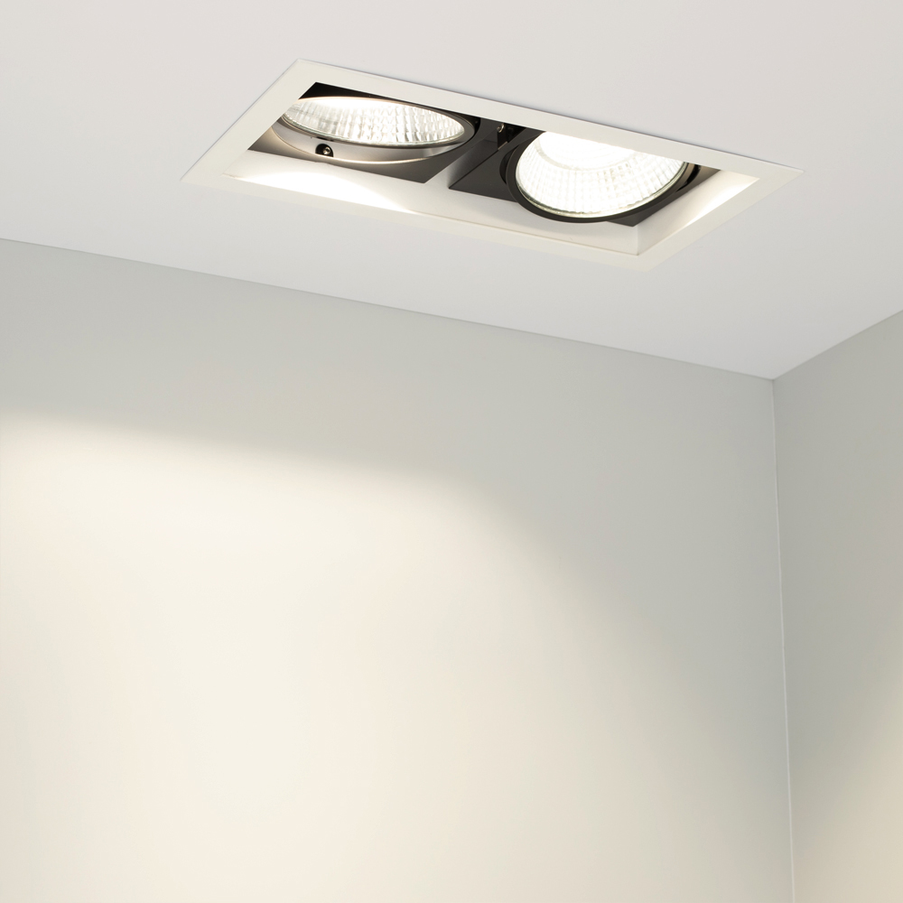 Встраиваемый карданный светильник. Угол 30° / 2x25Вт / ТЕПЛЫЙ 3000K / 4800лм, CRI>90. Корпус из белого алюминия с черными вставками. Питание AC220-240V, 50Вт, 700mA 30-42V, драйвер в комплекте, 2 шт. Размеры LxWxH: 283х152x100мм, отверстие для установки 265x135мм.