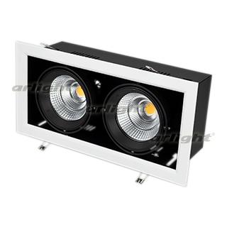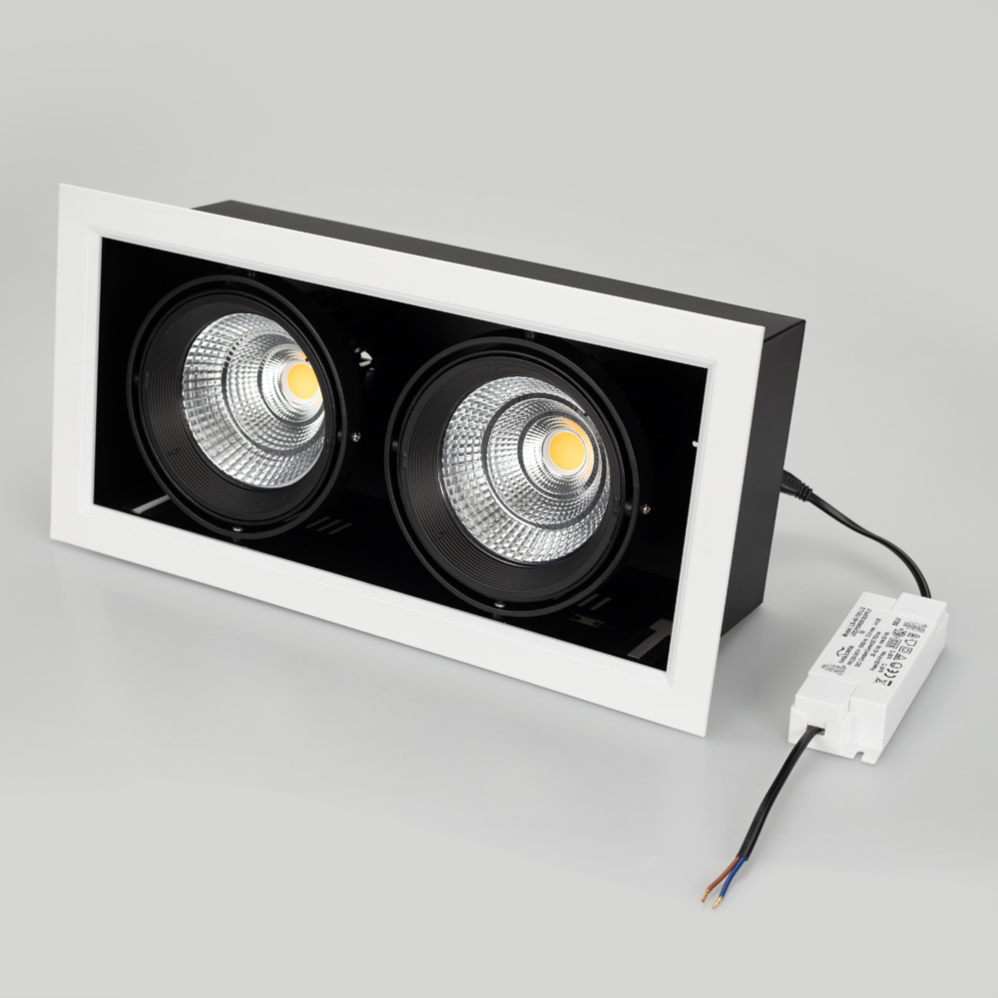 Встраиваемый карданный светильник. Угол 30° / 2x25Вт / ТЕПЛЫЙ 3000K / 4800лм, CRI>90. Корпус из белого алюминия с черными вставками. Питание AC220-240V, 50Вт, 700mA 30-42V, драйвер встроенный, 2 шт. Размеры LxWxH: 375х190x125мм, отверстие для установки 350x165мм.
