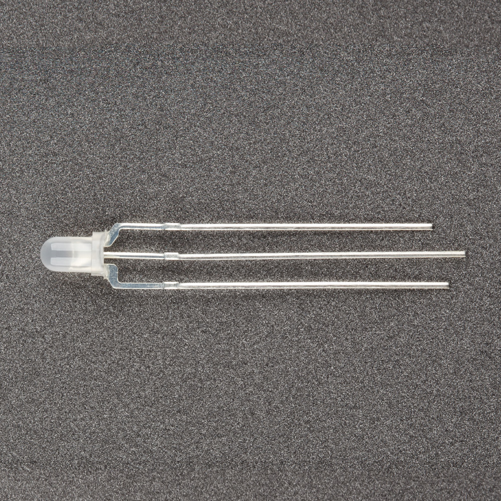 3-х выводной светодиод, круглый, матовая белая линза D=3мм. 2 цвета свечения КРАСНЫЙ 625нм IV=100-180mcd, ЗЕЛЁНЫЙ IV=70-120mcd при IF=20mA, VF(V)=2.0-2.5V. Угол 40°. 3 вывода, общий АНОД