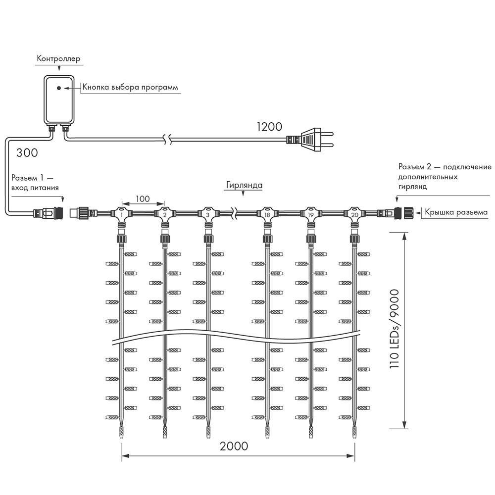 Светодиодная гирлянда "Занавес" с эффектом "ВОДОПАД", серии Classic. Размер 2000*9000 мм (длина 2000 мм, высота 9000 мм). Цвет светодиодов БЕЛЫЙ. Материал провода - прозрачный ПВХ. Диаметр провода 2.3 мм. 20 нитей длиной 9000 мм, ниспадающих вниз. Количество светодиодов 2200 шт, 110 на каждой нити. Размер светодиодов 5 мм с защитным колпачком с вогнутой внутрь линзой. Напряжение питания AC 230V, потребляемая мощность 180W. мер светодиодов 5 мм с защитным колпачком с вогнутой внутрь линзой. Напряжение пита