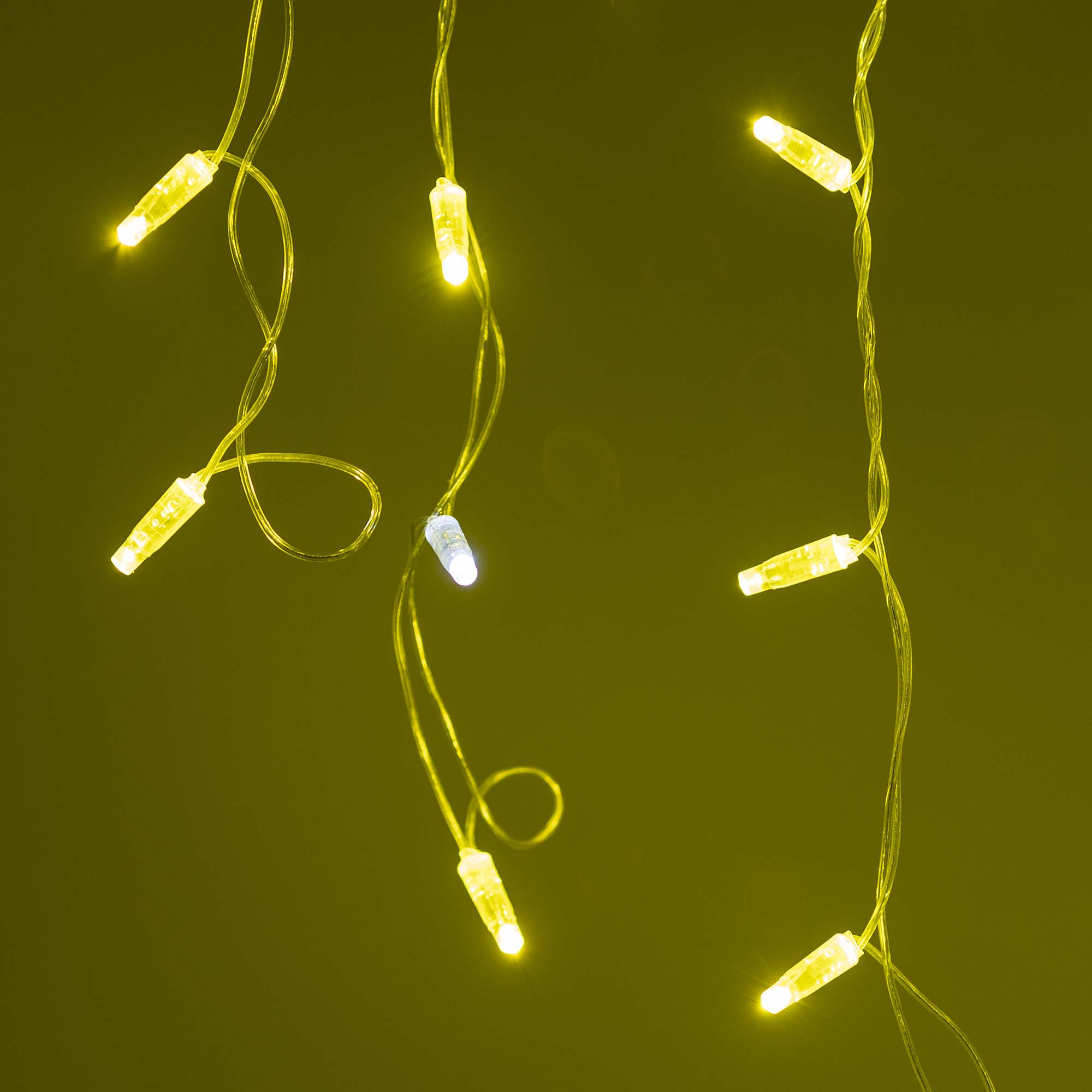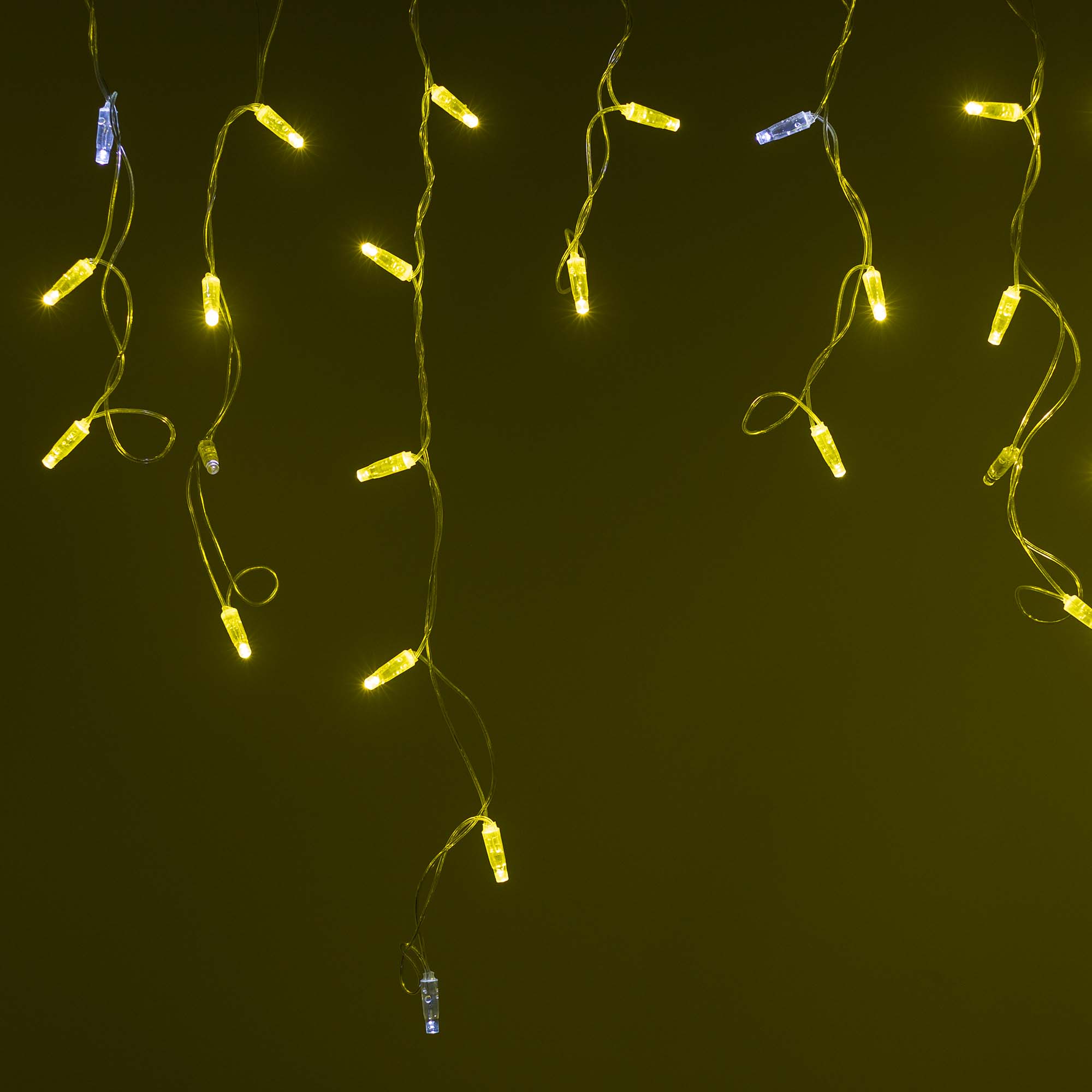 Светодиодная гирлянда "Бахрома" серии Classic. Размер 2400x600 (длина 2400 мм, максимальная высота 600 мм). Цвет светодиодов ЗОЛОТО. Эффект мерцания (Белый цвет 6000К). 180-200 вспышек в минуту. Материал провода - прозрачный ПВХ. Диаметр провода 2.3 мм. 24 нити длиной от 200 до 600 мм, ниспадающих вниз. Количество светодиодов 88 шт. Размер светодиодов 5 мм с защитным колпачком и вогнутой внутрь линзой. Напряжение питания DC 230V, потребляемая мощность 6W, IP65. Для подключения одной гирлянды или нескольки