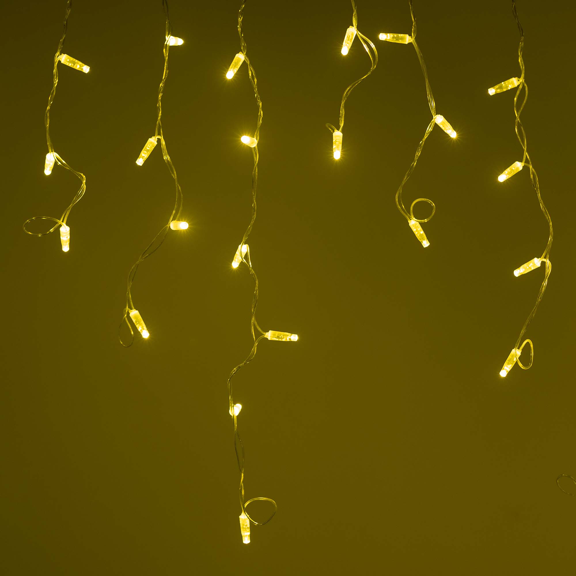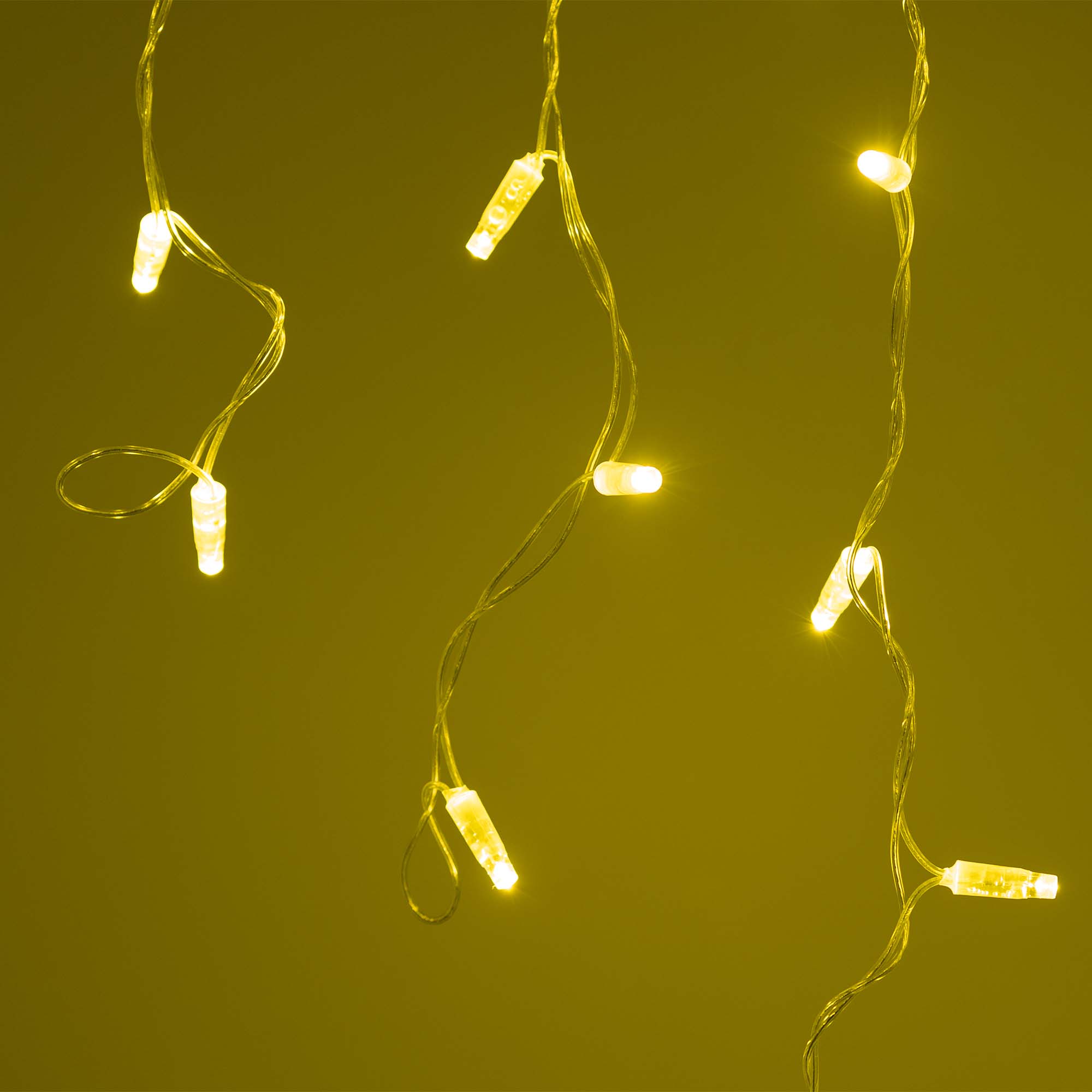 Светодиодная гирлянда "Бахрома" серии Classic. Размер 2400x600 (длина 2400 мм, максимальная высота 600 мм). Цвет светодиодов ЗОЛОТО, постоянное свечение. Материал провода - прозрачный ПВХ. Диаметр провода 2.3 мм. 24 нити длиной от 200 до 600 мм, ниспадающих вниз. Количество светодиодов 88 шт. Размер светодиодов 5 мм с защитным колпачком и вогнутой внутрь линзой. Напряжение питания DC 230V, потребляемая мощность 6W, IP65. Для подключения одной гирлянды или нескольких гирлянд к сети необходимо приобрести пр