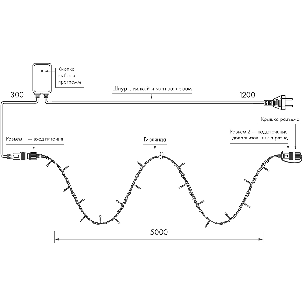 Светодиодная гирлянда "НИТЬ" серии Home. Длина 5000 мм. Цвет светодиодов RGBY (цвет светодиодов чередуется). Материал провода - тёмно-зеленый ПВХ. Диаметр провода 2 мм. Количество светодиодов 50 шт. Эффект динамики. Размер светодиодов 5 мм с вогнутой внутрь линзой. Напряжение питания DC 230V, потребляемая мощность 3.5W. Гирлянда укомплектована проводом питания с выпрямителем AC/DC и контроллером с 8 встроенными программами динамической смены цвета. Степень защиты от воздействия окружающей среды IP20. Темп