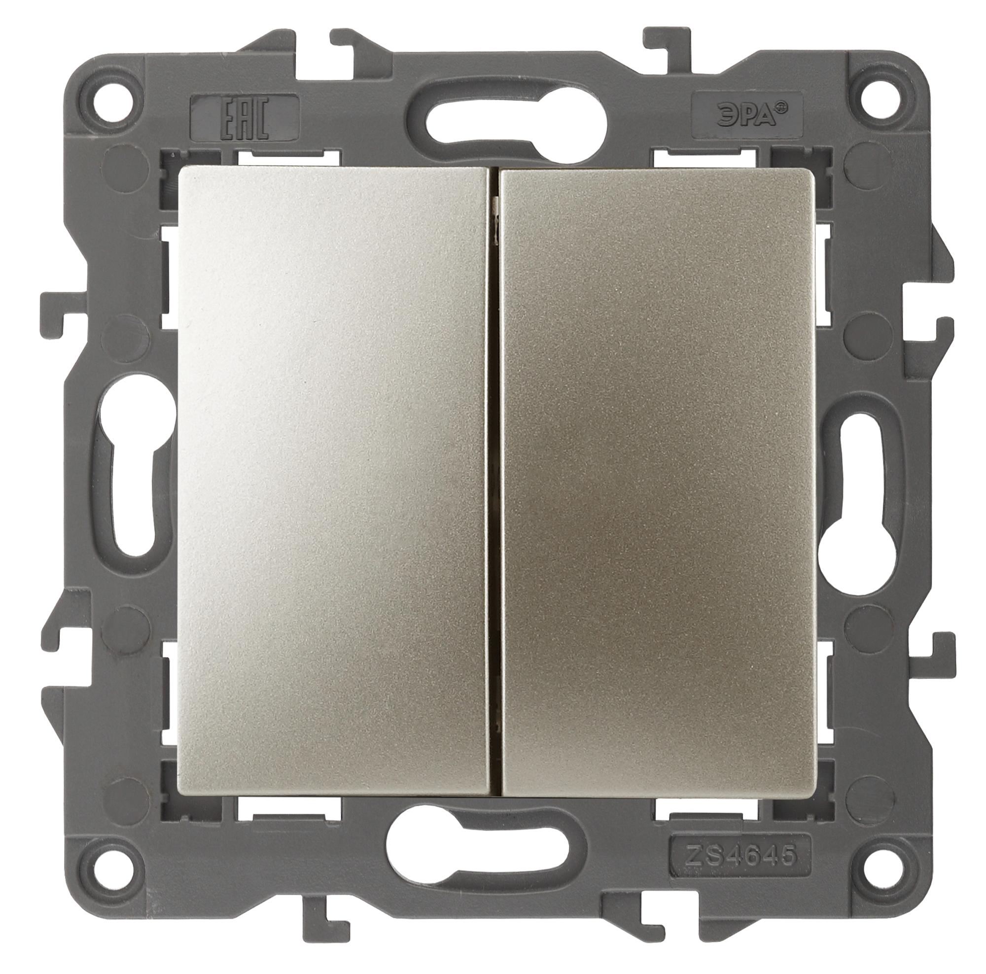 Выключатель 2-клавишный Elegance шампань 14-1104-04. Оснащён автоматическими клеммами для надёжной фиксации жил кабеля в механизме. Рамки приобретаются отдельно.